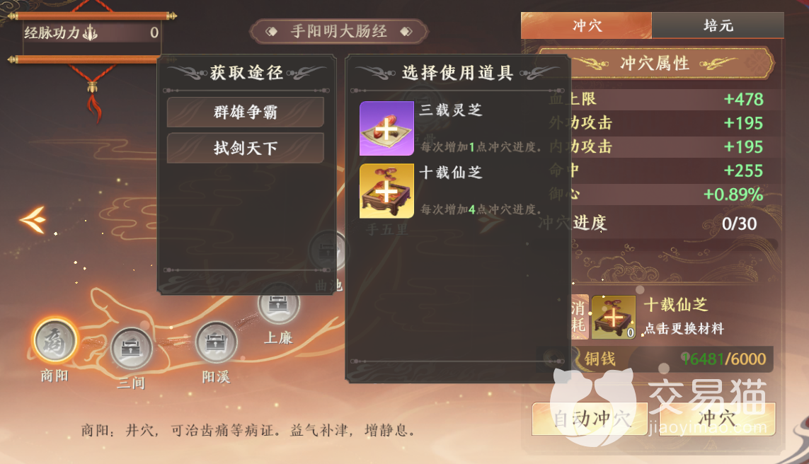 紫色的三载灵芝可以通过带有竞技性质的两个活动来获取,十载灵芝则需要前往每日限购中氪金获得,不过价格不算贵,但每天只能买一次,建议大家直接买七天的,这样会稍微便宜一些。另外需要注意的是不同的穴位增加的属性本身也会不一样,在解锁它们的时候可以先去查看一下,如果现阶段用不上,可以先在其他的经脉进行冲穴。