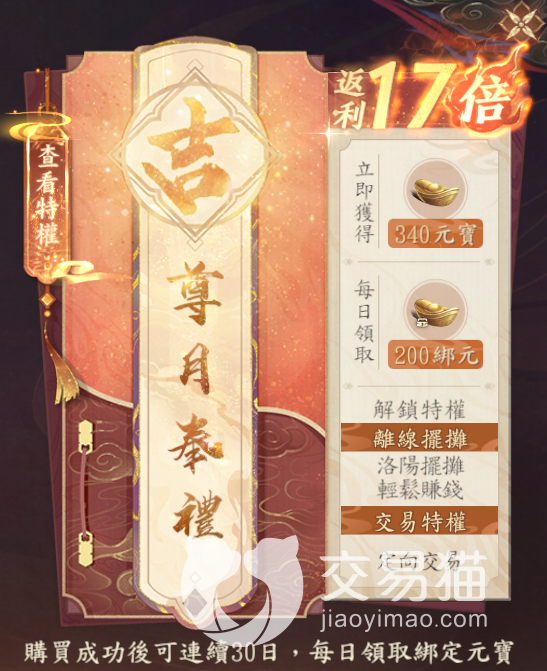 然后“吉”字版的月卡则是单独购买30,永久购买128,它相比前一个来说,在元宝这块给的更多,购买可直接领取340元宝,之后每天更是能领取200绑定元宝。