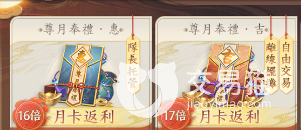 月卡分别有“惠”字版和“吉”字版两种,这两种给予的福利和特权略有区别,而且给的元宝数量也有一定差距,所以它们的价格肯定也不一样,首先是比较便宜一些的“惠”字月卡,它单独购买一次的价格是18块,购买之后可以立刻获得两百元宝,并且之后的每天还能再额外领取110个绑定元宝。