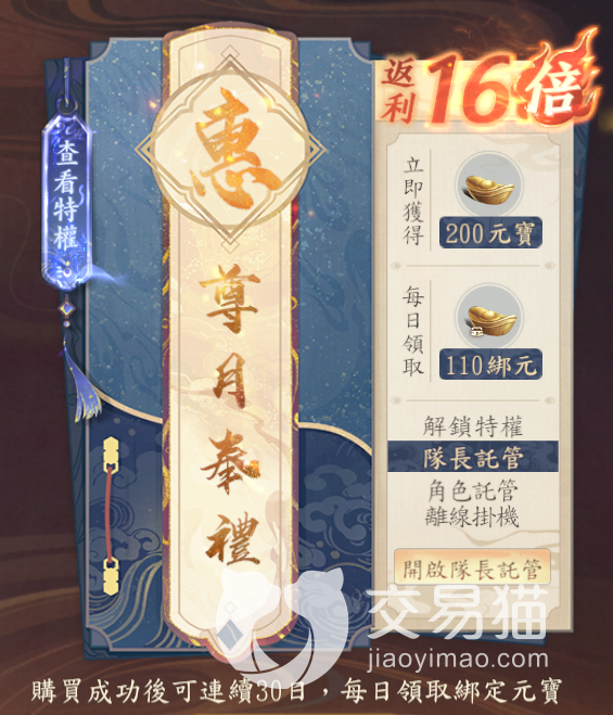值得一提的是它还附带托管和挂机两项功能,极大的方便了角色的自动刷本,所以这里建议大家直接开永久版的,因为它的永久版也只要68,相当于用原本单独买半年的价格就可以终身享受这些元宝和挂机托管特权了。