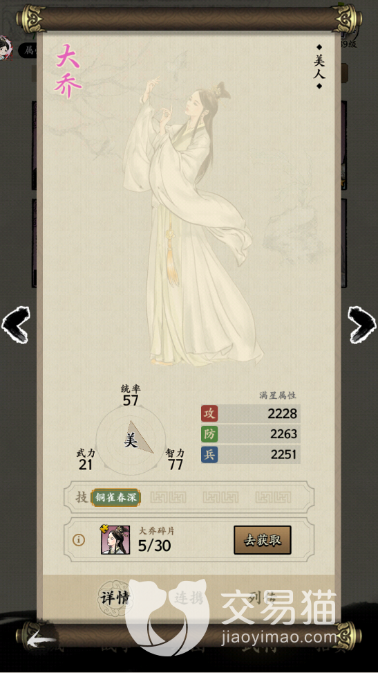 大乔是除了关嫣之外攻击最高的一个角色,虽然看武力值不高,按时她的攻击在满星之后也可以达到两千多,关键是大乔的技能铜雀春深给友军恢复的兵力数值比较多,做奶妈的话,大乔比较适合。