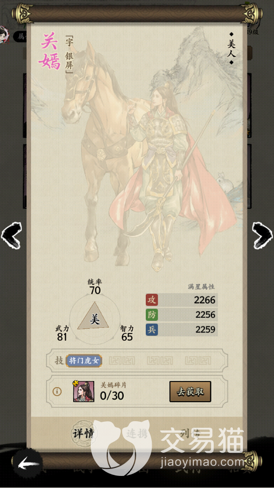这个角色在美人中是最难获取的一个角色,但是同时她的武力值也是这些美人中最高的一个,其他的美人基本武力值都没有超过50,但是关嫣的武力值有81,而且她的技能将门虎女也是可以带来免伤效果的,还可以跟关羽产生连携效果,要比那些没有连携武将的美人强一些。