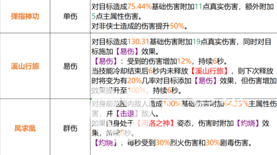 至于技能加点,小编建议先点出凌波微步这个位移技能,输出技能则选择弹指神功,有高机动性的这个位移技能与高单体伤害的弹指神功相互配合后,足以应付前中期的所有副本了。当我们等机够高的时候,就可以把技能点点到“凤求凰”这个群体伤害啦,同时还会为敌人附加击退这个控制效果以及灼烧的异常状态哦,可谓是十分厉害的一个群伤技能了。