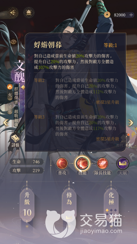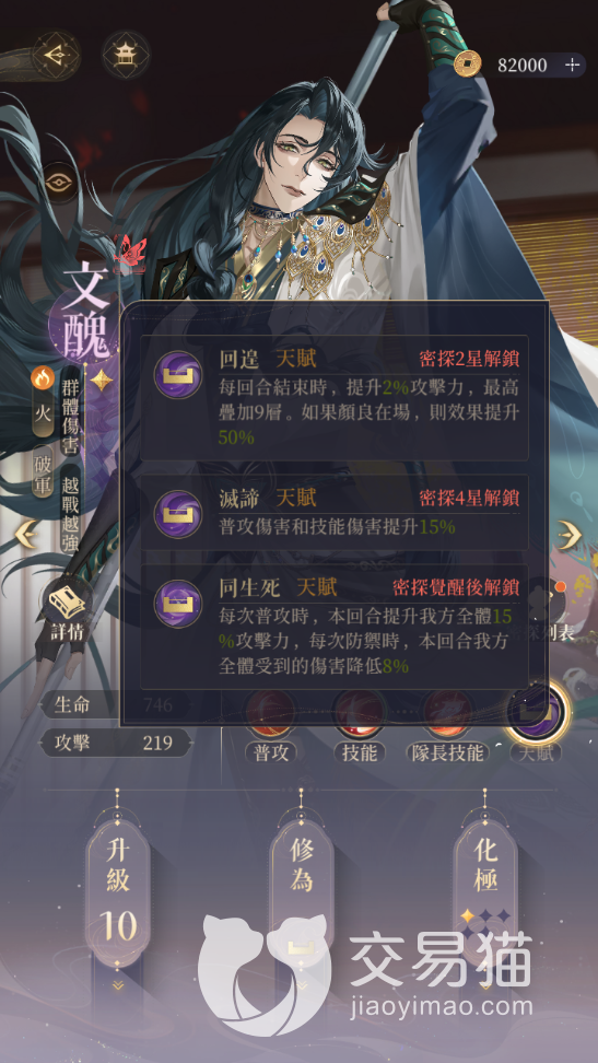 天赋:二星会解锁“回遑”,可以令文丑在回合结束时直接提升2%的攻击力,并且可最高叠加九层,而且还可以在文丑在场时额外提升50%效果,有了这个之后文丑的攻击和后续输出就会变得更高。