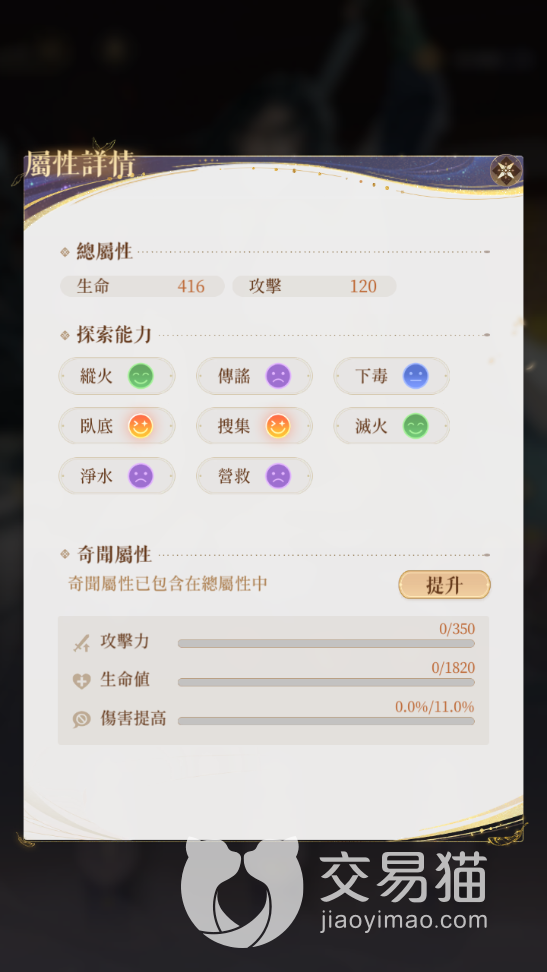而在探索能力上,它最为擅长的是卧底与搜集,这就意味着在很多剧情中,它都能够扮演一个侦查类型的角色,可以帮助主角来搜集各种敌人的情报然后反馈出来,另外在纵火和灭火上它也有着不错的表现,可以说是将火焰这块玩的十分透彻了,不过传谣,净水和营救它却不是很擅长,所以在这方面剧情发生时可能会比较被动。