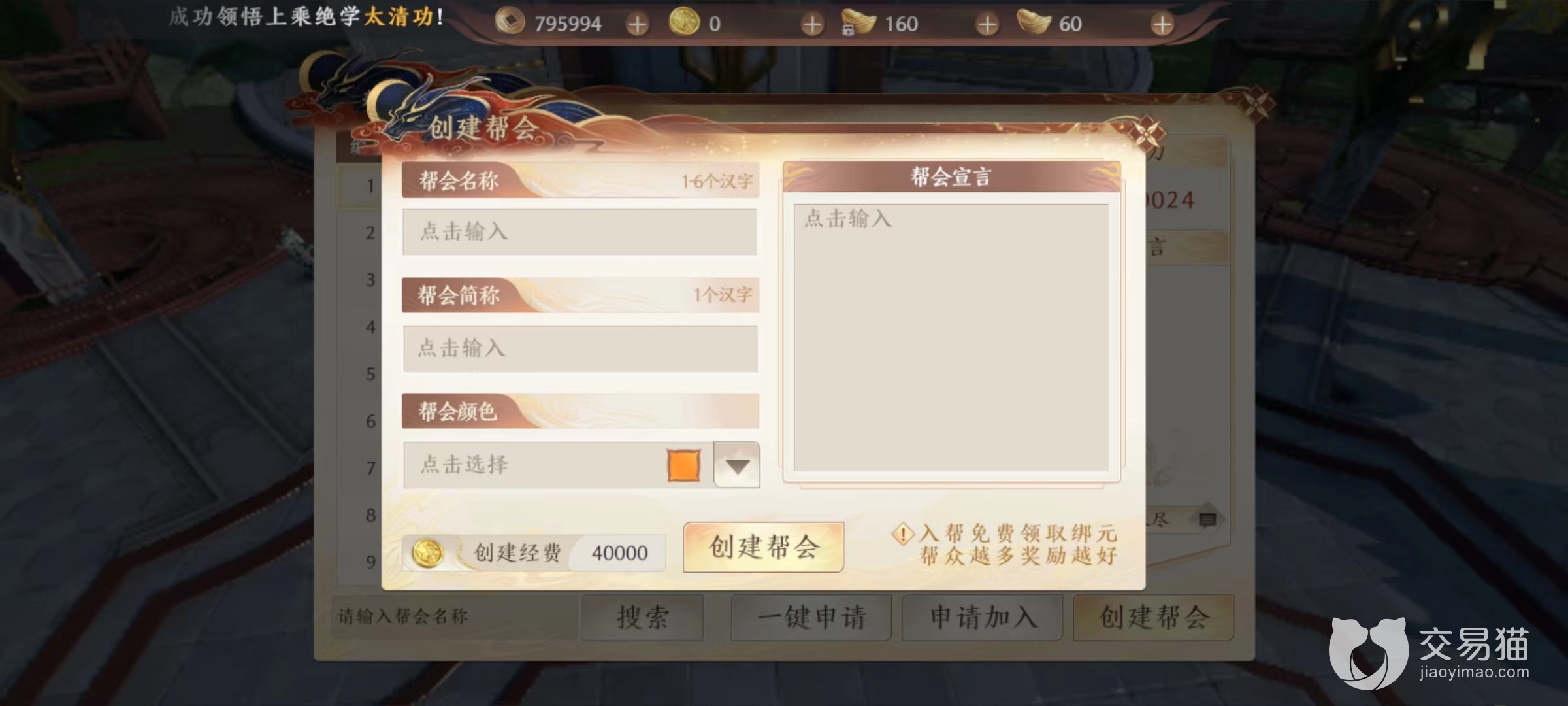 当跟随主线任务达到20级之后,会自动开启了解帮会玩法,从此开始就可以开启加入帮会或者是自己建造的操作。加入比较简单,只要选择一个自己喜欢的,点击申请,管理人员同意之后就能加入。但是要想创建需要付出较大代价,首先是要想好帮会名称和简称,这两点关系到后续发展一定要妥善选择,最好能突出重点,接下来是为自己帮派设置好颜色以及填写好宣言,方便其他玩家快速了解。