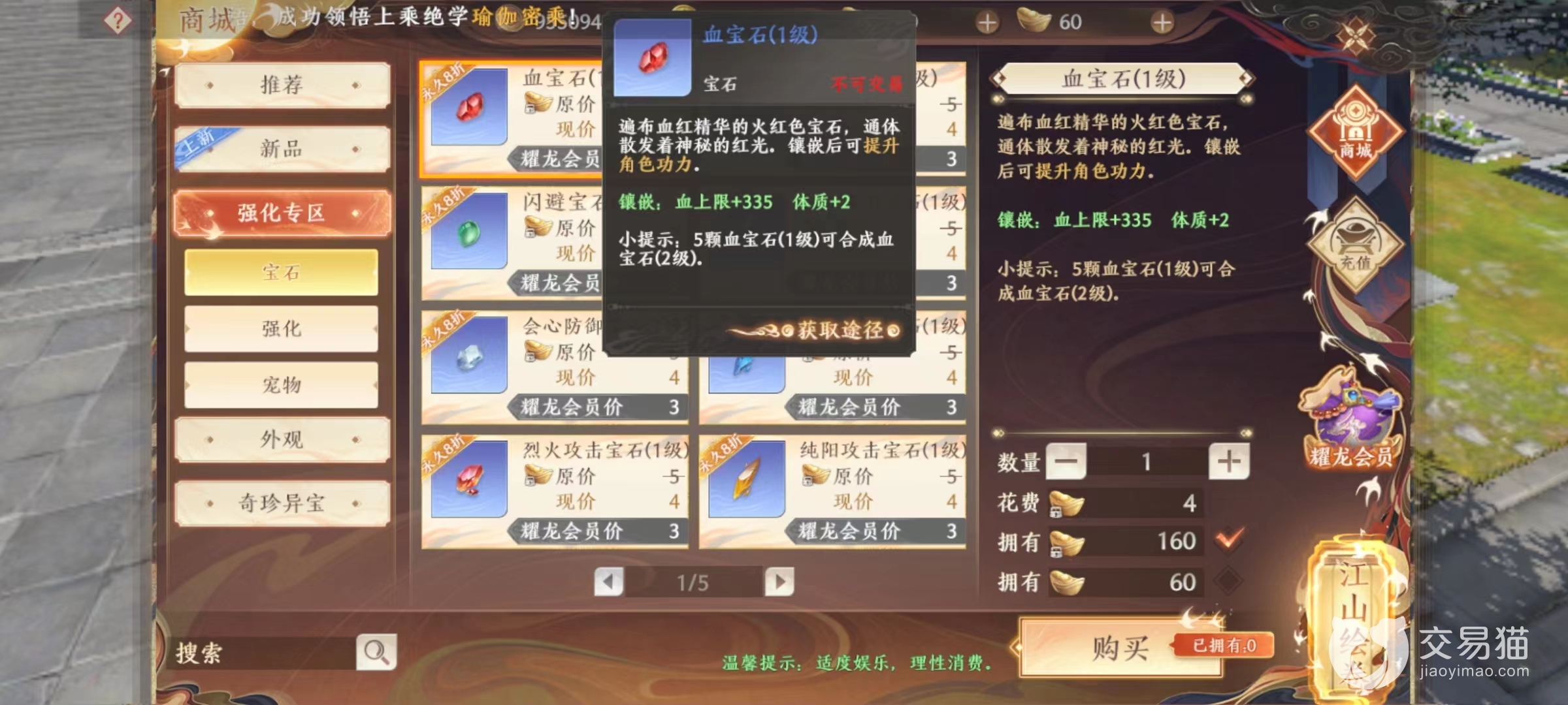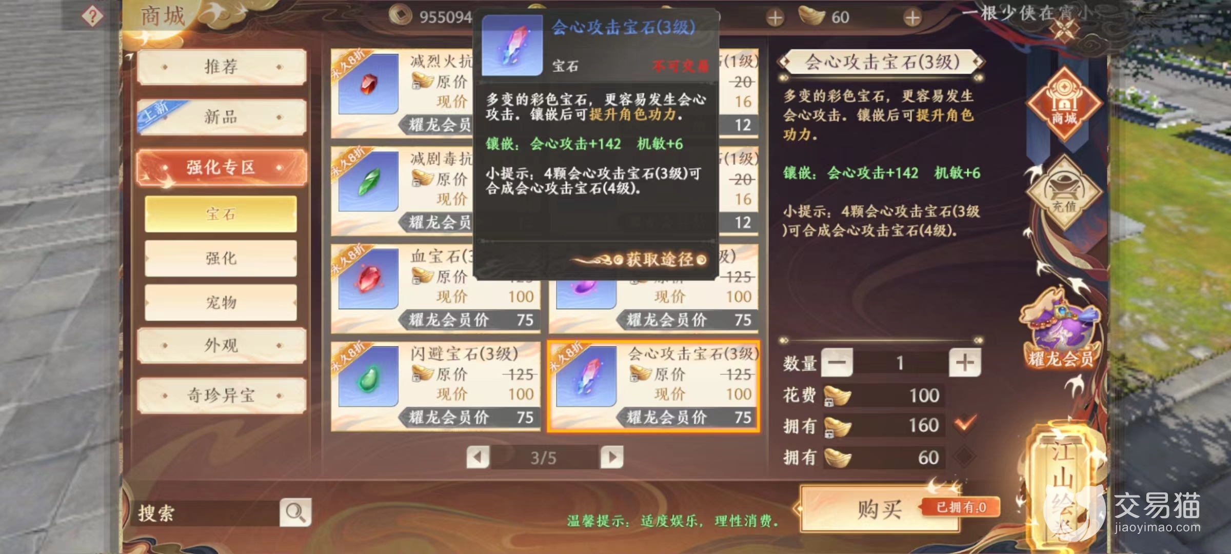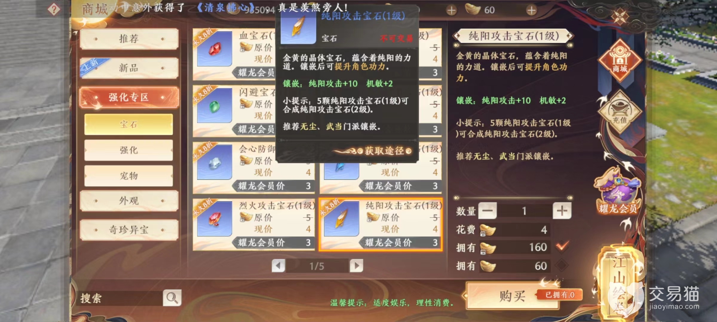 当玩家前期跟随主线任务达到相应等级的时候,可以看到有装备强化功能,点击进去后第1项就是宝石镶嵌功能。目前玩家总共可以穿戴9件不同位置装备,每件都可以镶嵌5颗宝石。而这些宝石除了可以在各种礼包中开启之外,还可还能够通过少数副本和活动刷新得到,但是后期升级需要数量很多,就不得不在商城中强化专区中直接购买。就是因为获取难度和付出的代价比较大,所以要妥善选择。