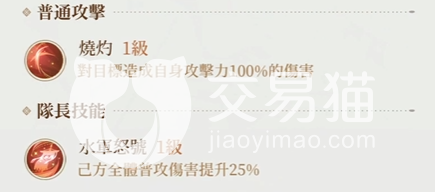 在普攻这块则是纯粹的100%单体伤害,本身没有额外的加成,不过如果你将其设置为队长出战,那么就会令全队获得高达25%的普攻伤害加成,这一加成无论是对于吕蒙自身还是其他队友都带来了显著的提升,加上之前大招本来也增加了攻击,所以它真正作用在实战中的时候,肯定也能一定程度弥补吕蒙在输出侧的缺陷。