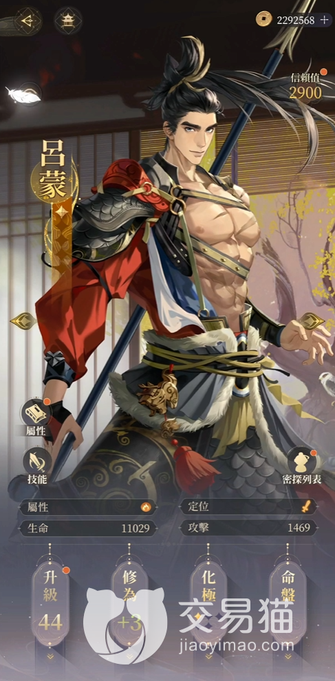 面板:四十四级的情况下他的生命就已经破万,从这就可以看出吕蒙的基础身板是极为坚韧的,他可以抗住更多次的伤害,在实战表现中这就意味着可以帮助后置位的队友吸收更多的火力,同时如果阵中有重要的输出也可以得到更稳定的保护,从而保障抢在敌人伤害自己之前拿下战斗。不过在攻击力这块吕蒙确实有些差强人意,这个等级连两千都没达到,在SSR中也算是比较弱的了,不过考虑到他承伤的定位,其实也没必要再在这块要求太多了。