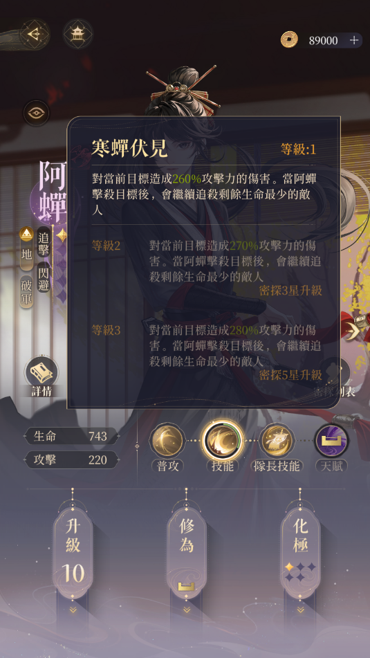 她的技能寒蝉伏见,这个技能在对目标造成了260%的伤害值之后,还有追击的额外伤害效果,可以继续追杀下一个生命值比较少的敌人,所以要是面对的敌人血量不多,阿婵用这个技能基本就可以清场了,所以阿婵这个角色还是比较推荐大家用的。