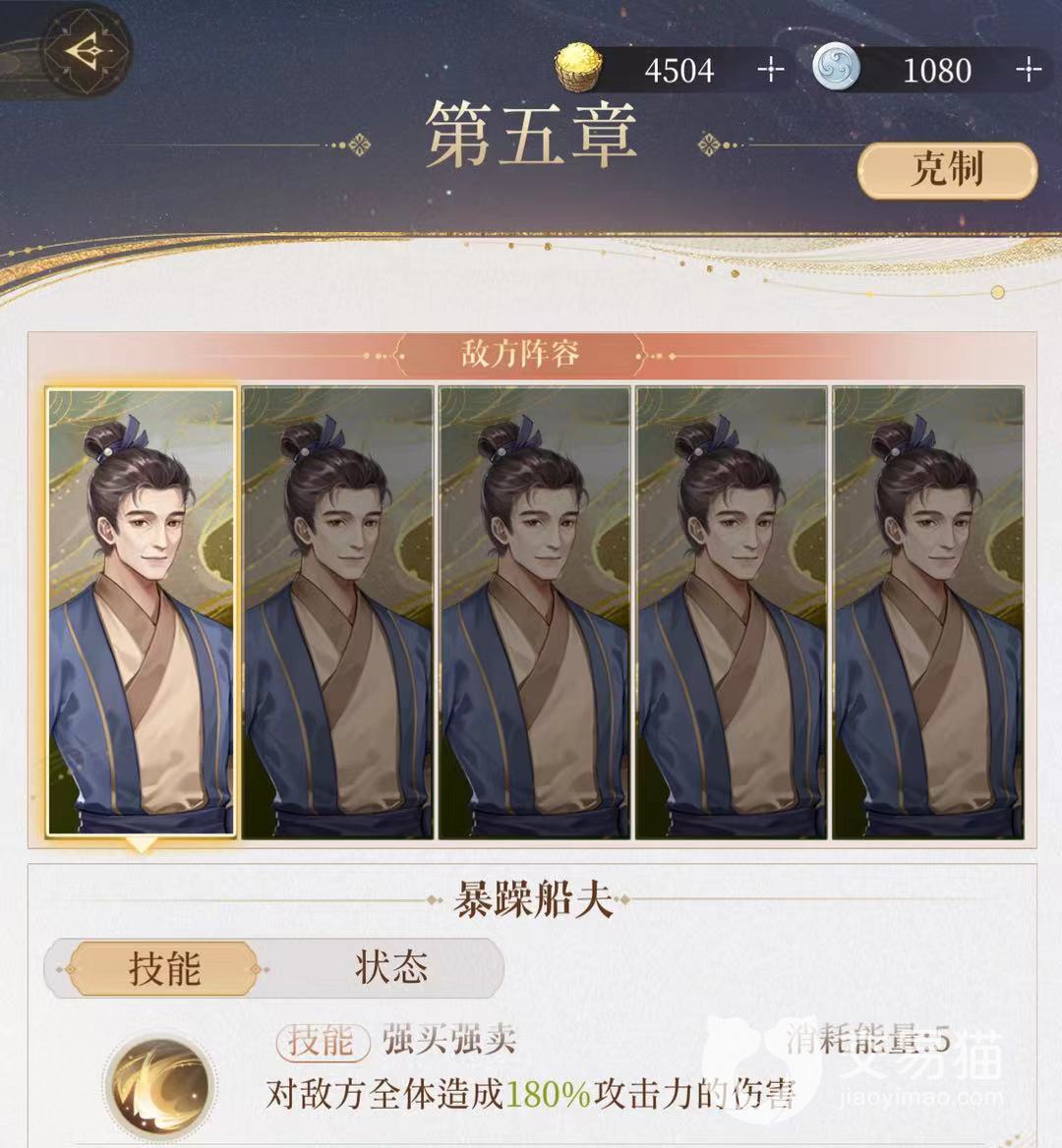 第1艘船的船夫比较好打,他们等级48级,属性分布是三个风属性与两个火属性,全部敌人的技能都一样,为强力单体5回合能量的180%攻击力伤害。