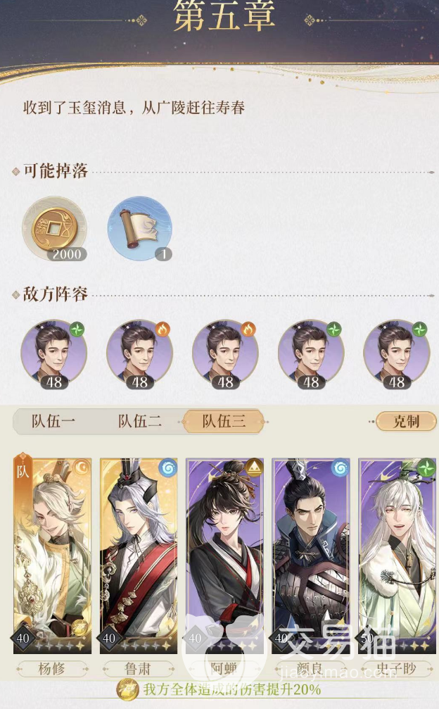 这阵容是大家都很熟悉的赌神阵容,如果鲁肃的等级不高,那么作为队伍的劝退工具人少攻击多防御,阿蝉可以换杨修等拥有高额单体输出的角色。