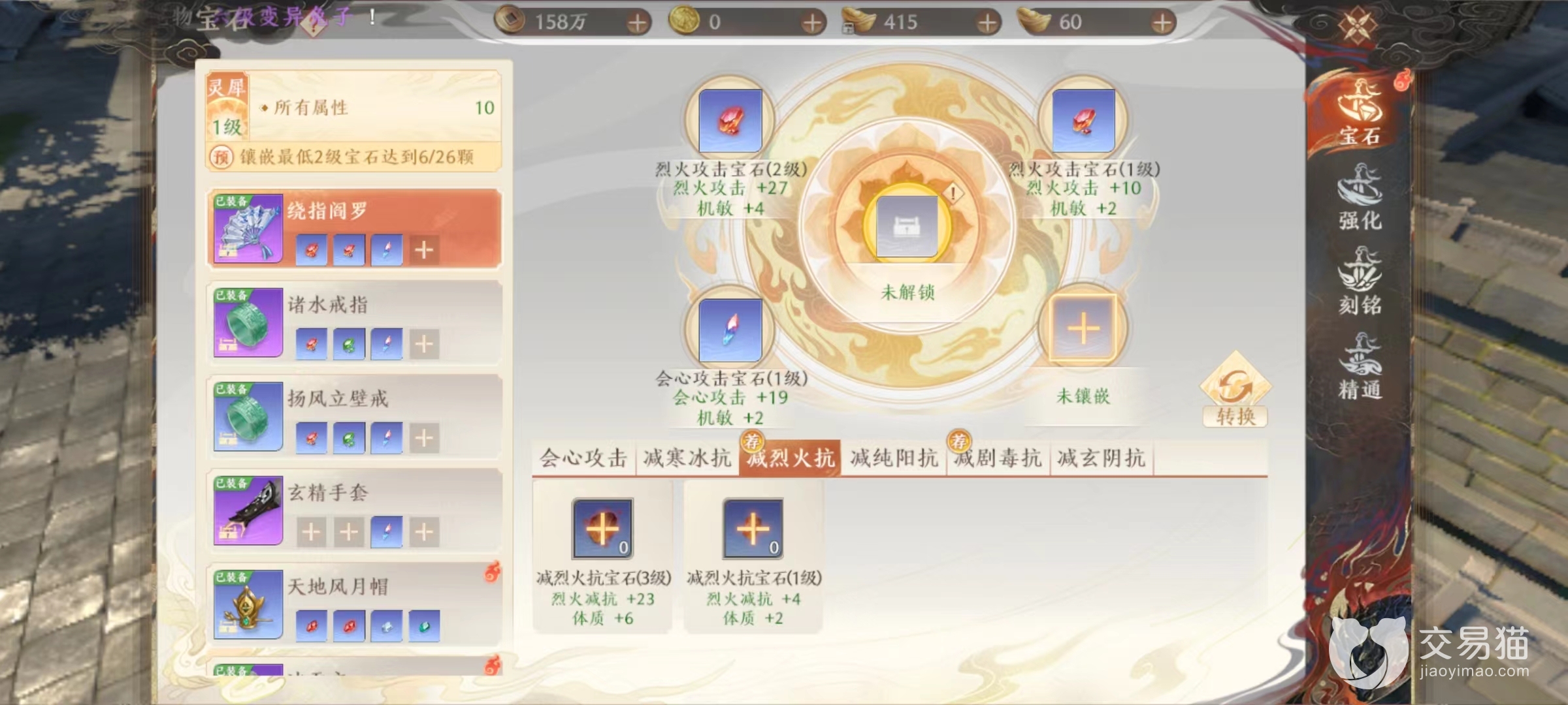 这两种属性宝石除了主属性之外还会附加机敏,机敏本身对于逍遥来说也很关键。接下来的镶嵌孔中,凡是有命中和会心攻击的,优先选择会心攻击。逍遥本身就非常依赖会心攻击造成的伤害爆发,而且会心攻击宝石还会附加机敏属性。接下来还有两种宝石属于降低对方抗性类型,依然是选择减烈火抗和减剧毒抗,这些宝石在镶嵌之后能够降低敌方对应的抗性,相当于间接提高了主属性伤害。但是在收益方面不如直接提高属性更可观。
