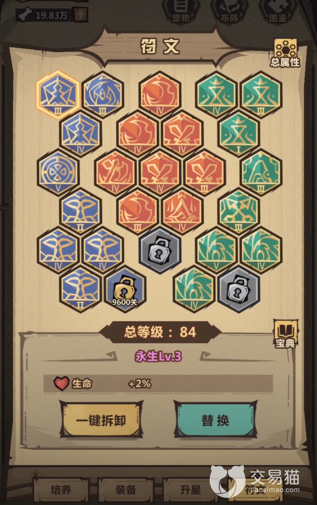 玩家开启完所有的符文格子之后,就可以给自己的狗将英雄搭配符文,其实这个搭配还是蛮简单的,主要就是增加攻击力,玩家可以根据选中的狗将的特点来进行搭配,像是曹操这种主力输出,就比较适合搭配上吞象、裂空与百炼的符文,把这几个符文给曹操穿戴上后,就能够很大程度地提升曹操的输出伤害,与此同时,还能保证它的生存时间足够长久,而像太乙真人这种输出就需要搭配上吞象、罗刹与惊鸿,以此来保证它的增益效果与辅助能力。