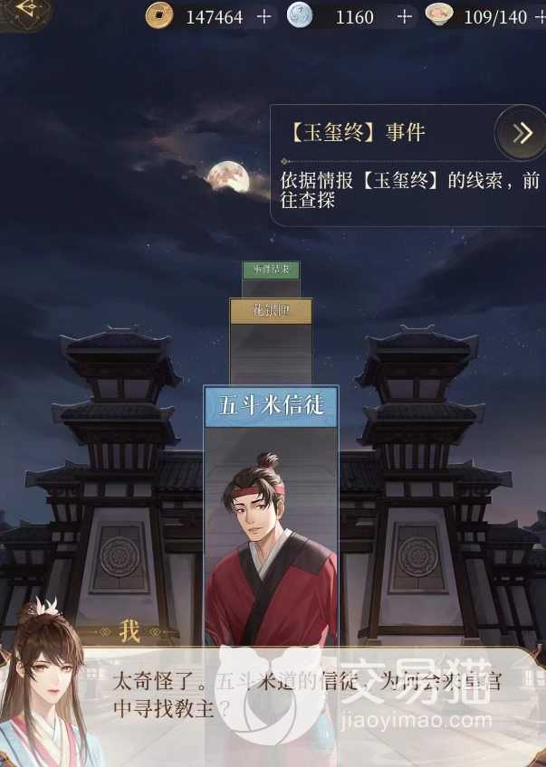 开局第一章第1节,玩家扮演广陵王带到天子密令隐秘进宫,经过一番飞檐走壁的操作之后,成功进入天子居室。与刘辩斟酒夜谈,接到寻找玉玺下落的任务,整个第一章都在忙于寻找玉玺,期间玩家可以旁敲侧击了解势力的分布。