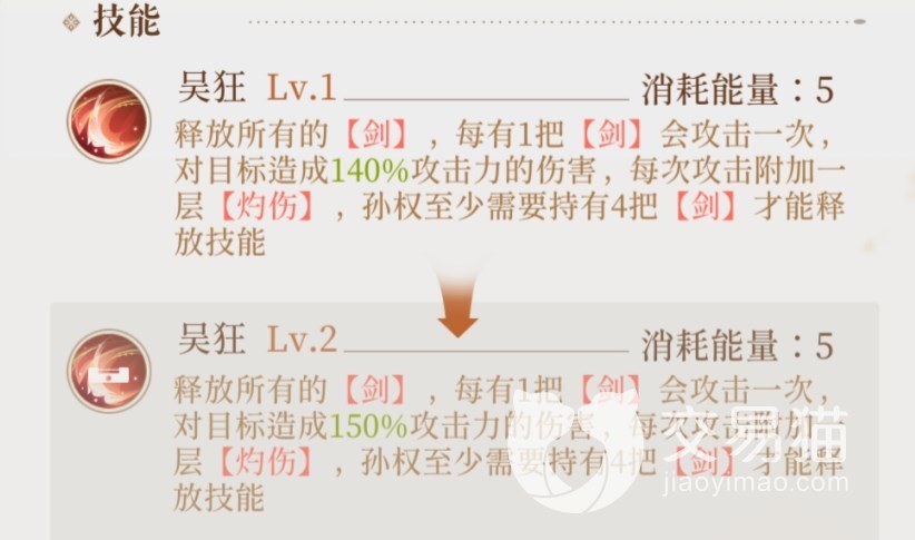 天赋能在战斗初始就有3把剑和1点能量,作为队长的话能很快就释放大招,如有陈登来加能量就更快了。孙权受击也有概率反击,同时有10%减伤,受到致命伤害免死1次回复30%血量,代价是所有剑消失。