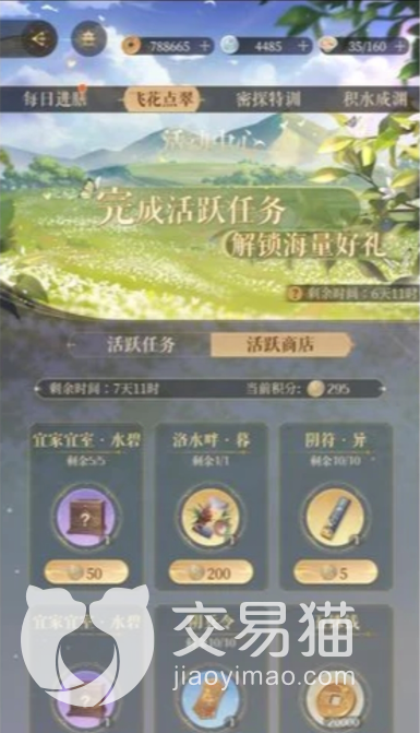 其次是每日刷新任务,分别是登入游戏1此,去相见互动3次,完成5次历练和消耗五铢钱20000这四个任务。玩家完成上述每日刷新的任务可以分别获得1,4,10,5积分,一共可以获得20积分。玩家要注意这些是会进行每日刷新的,所以玩家每天都可以获得20积分。