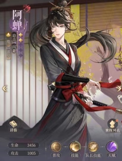 阿蝉这个角色还是比较适合防御的,所以可以多多升级,来增强防御和叠加伤害的能力,在回合制的时候一定要好好,并且它也有一个很厉害的能力,就是使用这个角色时,如果消灭了一个敌人,会有触发的机制,再去砍一刀,增加最高三次的连击,当敌人残血时,特别适合这个角色去收割。