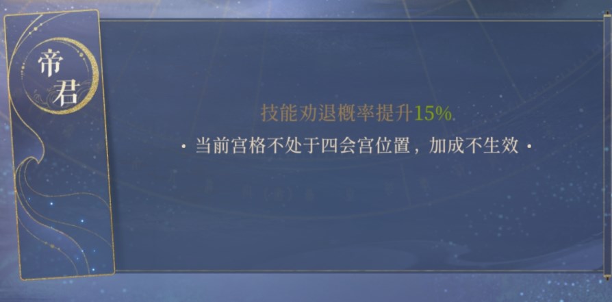 命盘有加伤害有加回能的,不过既然我们玩劝退,自然要最大化该效果,选择技能劝退概率提升15%这一项。而在搭配阵容的时候,可以考虑搭配强力输出型的角色,可以强力单攻,例如阿蝉、杨修、许攸。而在摆放位置上可以考虑放在最后或者最前,更容易触发技能概率范围。