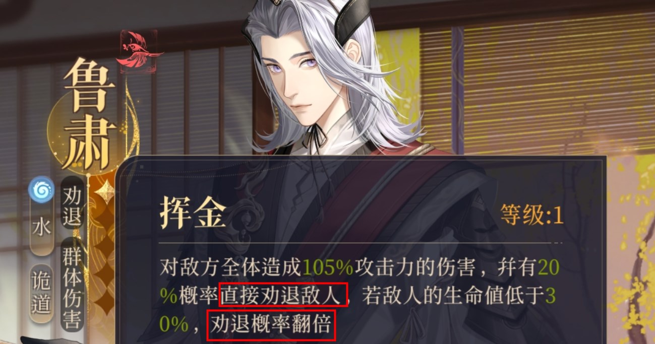 鲁肃是水属性的SSR,队长技能简单直接全队队友最大生命提升20%,普攻在人物二星的时候有5%的小几率劝退敌人,所谓劝退就是直接让其退场,但部分敌人能免疫该效果。