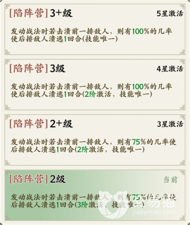 高顺的技能一般,在绿卡中都算下位圈:“陷阵营”,发动战法时若击溃前一排敌人,则几率使后排敌人溃逃1回合(1级时角色3阶激活,技能唯一),之后可通过给武将升星让“陷阵营”升级,从而降低技能触发门槛。最高至3+级,触发后排敌人溃逃的几率可达100%哦。
