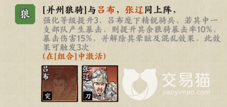 “陷阵营”这一技能触发机制蛮苛刻的,阵容中先要满足形成阵法,也就是说至少有3突骑上阵,即使触发了“溃逃”,效果也没有那么好。所以一般高顺会用来配合吕布、张辽上阵,达成“并州狼骑”:强化等级+3,当其中一人产生暴击,则提升其余人10%暴击率,和15%的暴击伤害,同时解除晕眩和混乱效果,此效果一共可触发3次。