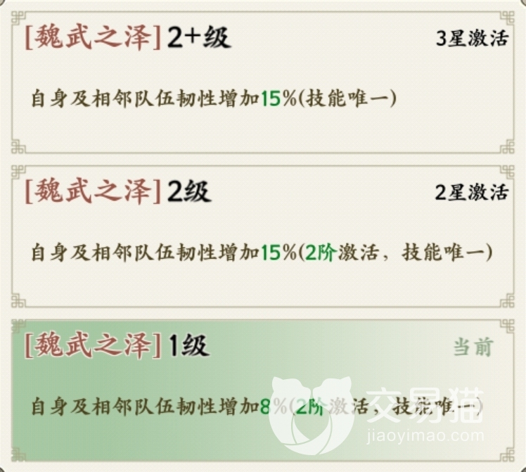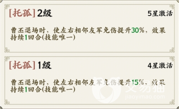 他的第二个技能“托孤”,在曹丕下场时触发,可以使左右相邻的武将的免伤提升15%,角色激活至5星时最高百分比可到30%,持续时间1回合。禁卫形成阵法时也有增加韧性的效果,如果大家想让队伍抵抗暴击的能力更强的话,让曹丕上场是合适的。