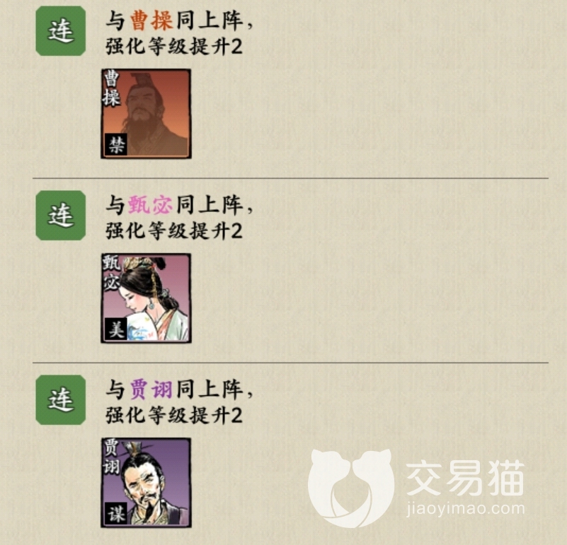 曹丕目前还没有组合技能,和曹操、甄宓、贾诩同上阵可使强化等级提升2。在实际战斗中,三费的禁位一般只是作为备选过渡用的,4、5费的禁卫是首选,再加上曹丕也没参与好用的连携组合,所以玩家不太常用这一武将。