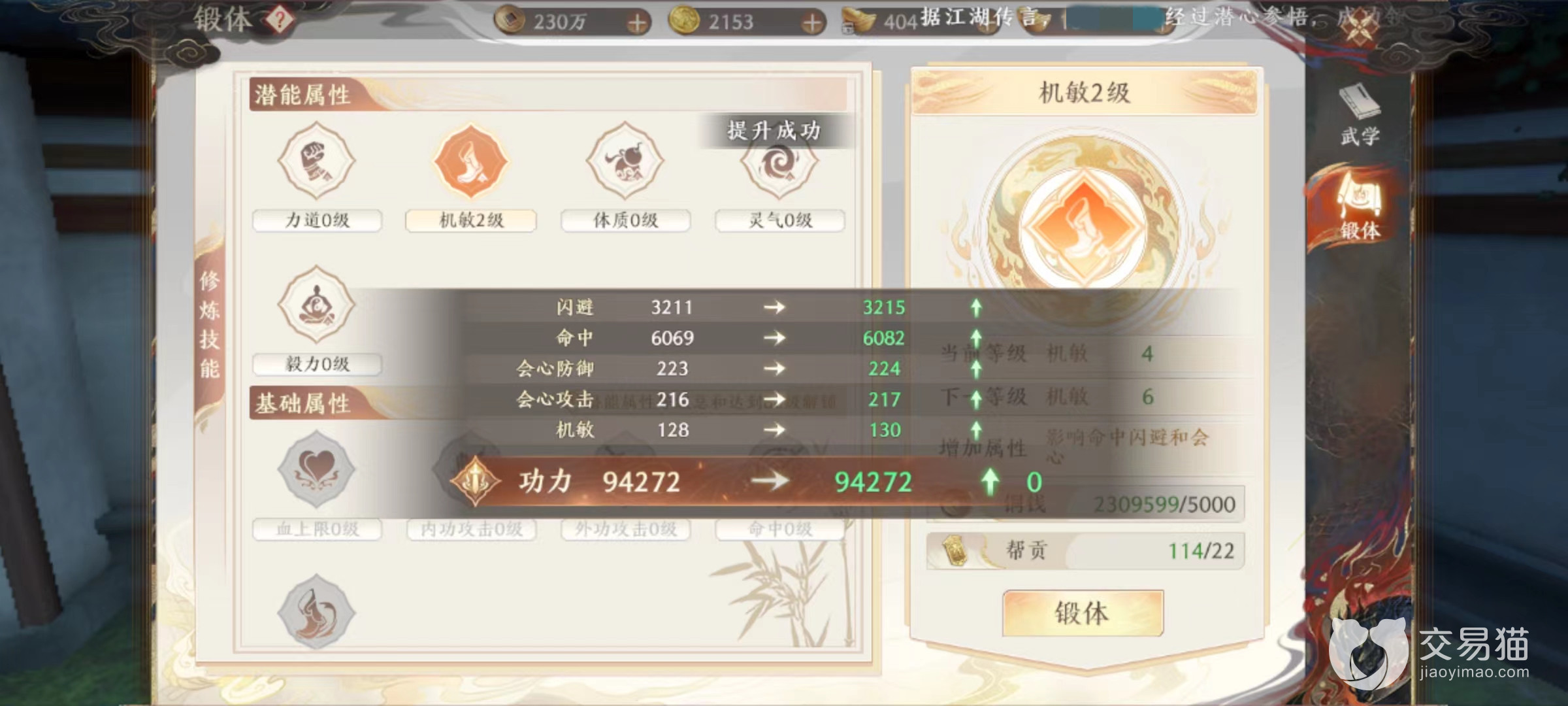 要想进行锻体,首先要达到指定等级并且加入帮会中,然后在武学选项里就可以看到有锻体功能,进入其中之后有潜能、基础、高级三个不同分类。潜能属性是最初开放类型,就是对针对玩家五大基础属性,力道、机敏、体质等,对于丐帮来说优先提升的当然是机敏。毕竟能附加命中,闪避和会心率,是丐帮最关键几大属性之一,在攻击和防御方面都有突出表现。当机敏提升起来之后,因为要想激活后面的基础属性,还需要潜能达到80级,另外一些可以分配给力道或是体质,这两项都很合适。