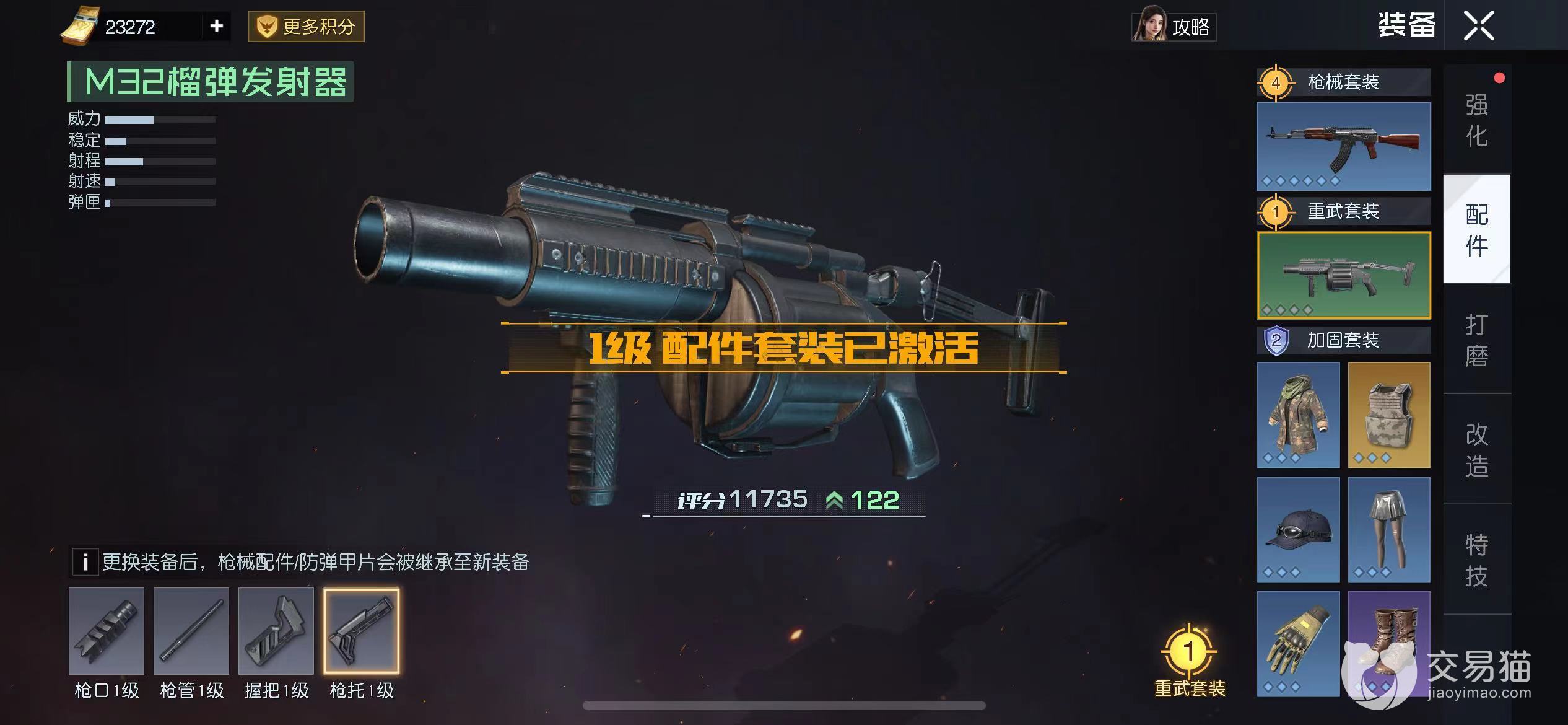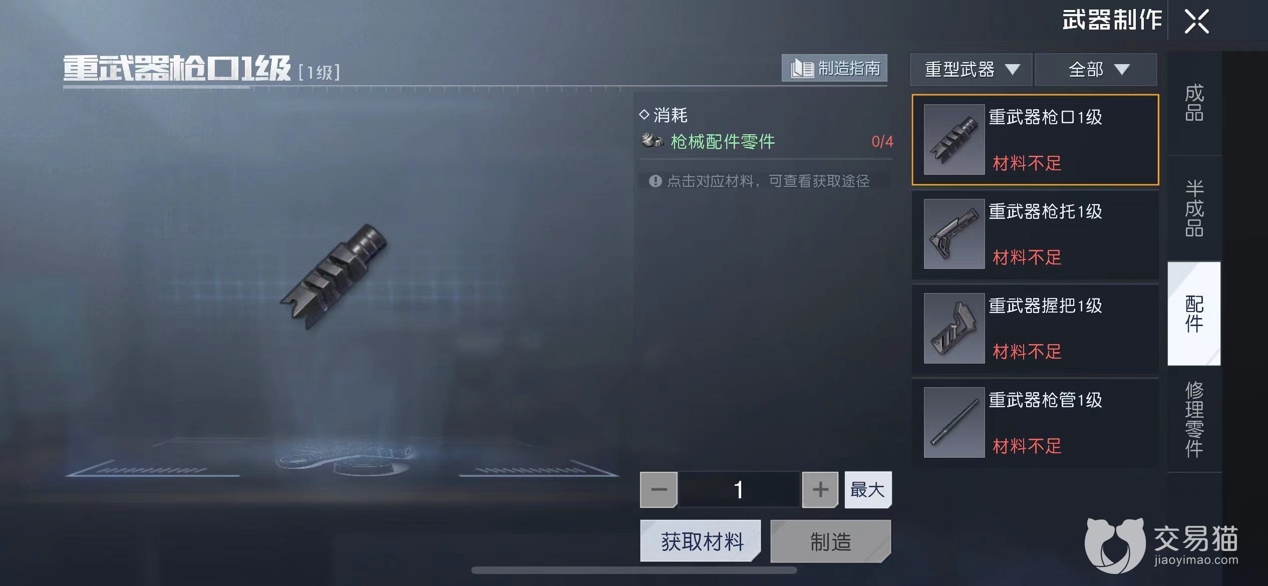 重型武器和主武器一样,制作完毕后都可以增加配件套装,与主要的枪械套装不同的是,重型武器只装四种配件套装,比枪械少了两个。那配件套装又如何获取呢,还是通过装备制造台进行制造即可。