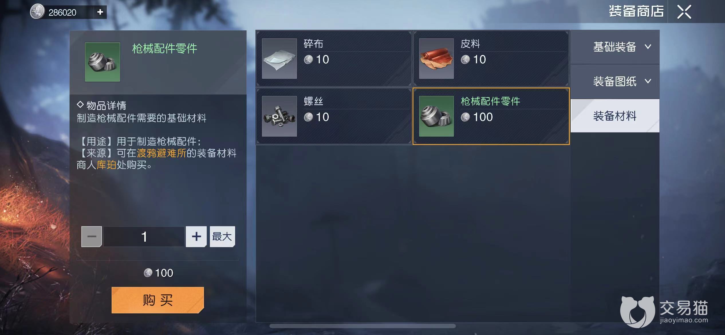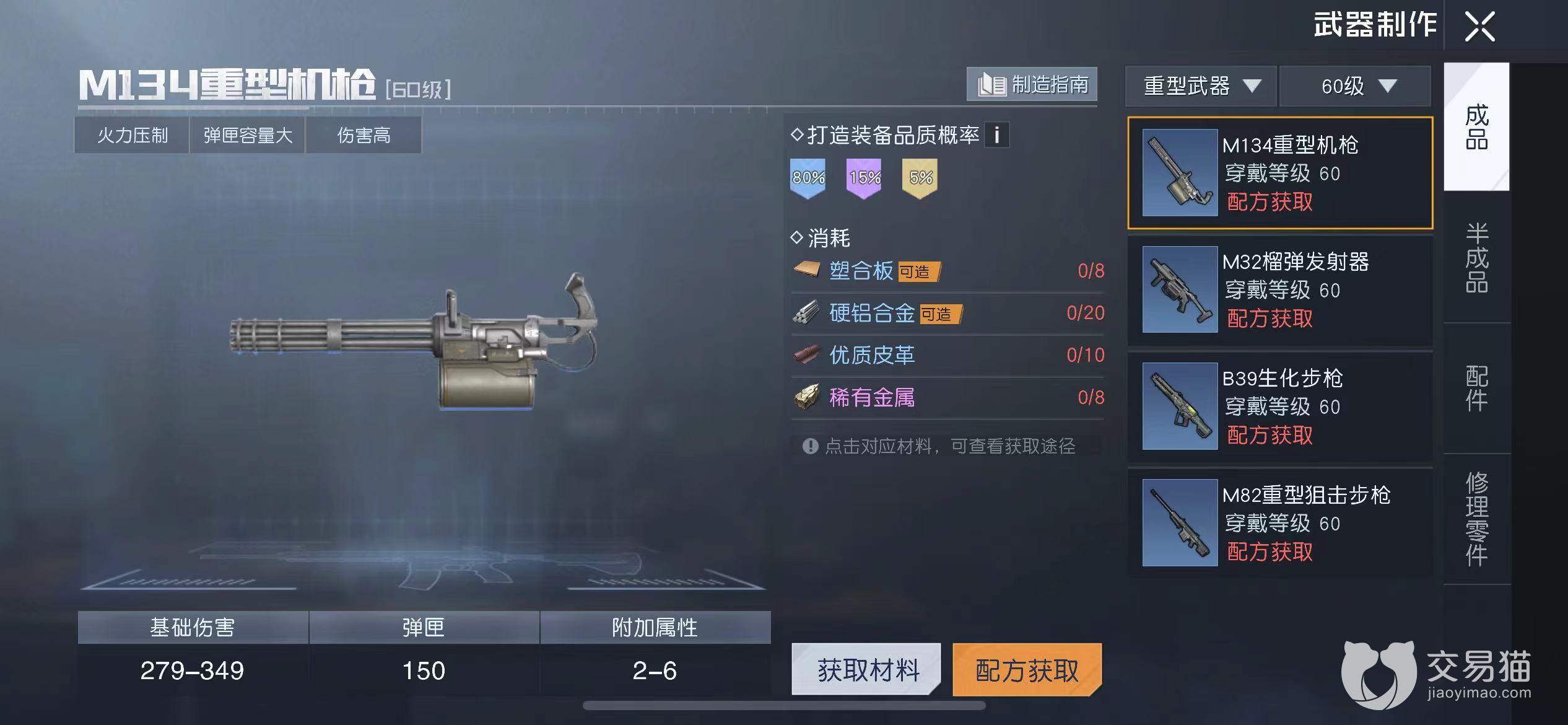 当玩家小伙伴达到一定的等级后就可以通过装备制造台制造出武器,重型武器也是在其中之列的,通过装备制造台我们可以看到通过原料制造出一部分的半成品,再由几种半成品制造成武器,可光是有材料还不够,我们还需要配方获取,如何获取呢,前往渡鸦避难所的装备材料商人库珀处购买就可以了。