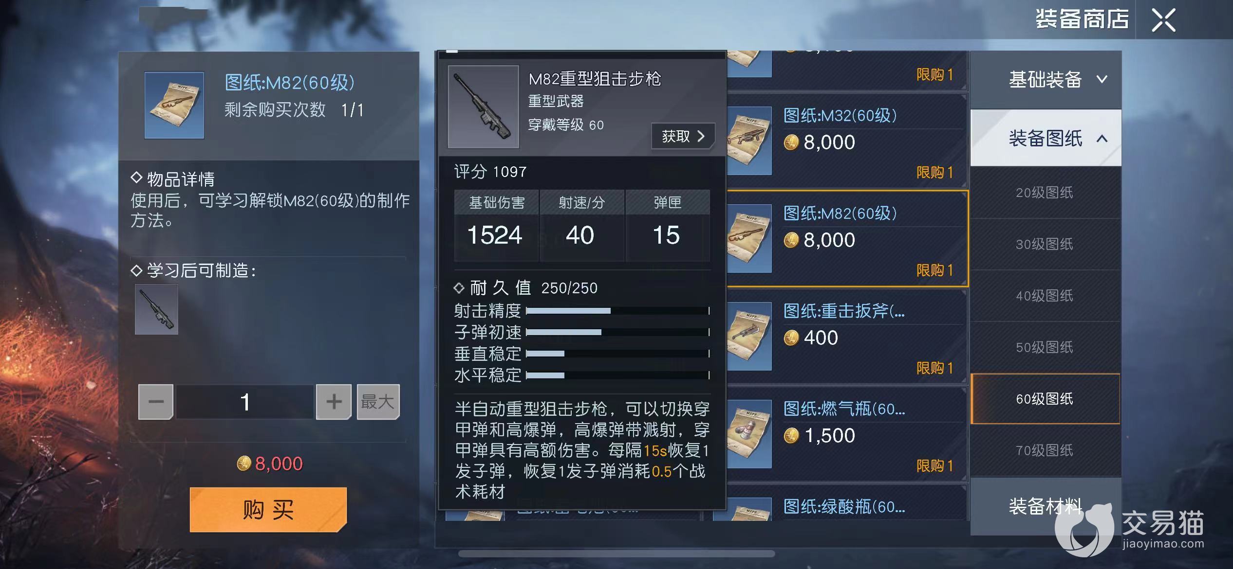 点击库珀的装备商店,我们找到装备图纸,可以看到其中20-70级的武器装备不等,如果是只找重型武器的话,可以点开图纸,然后点击右侧学习后可制造的武器图片,能够显示出该武器的类型等信息,这里有一点需要注意,装备的图纸是需要金币购买的,金币可从游戏中获取,玩家小伙伴们可以多通过一些任务获取。