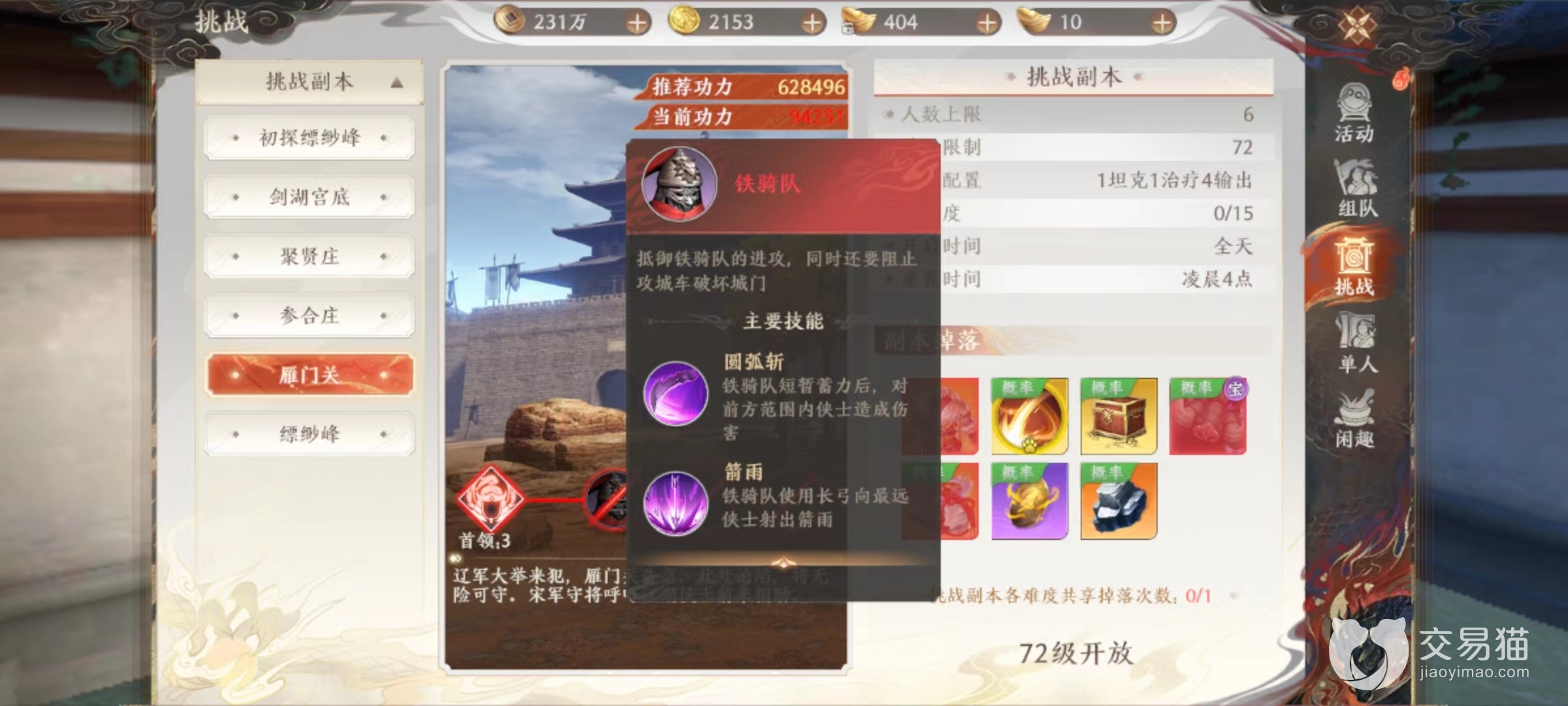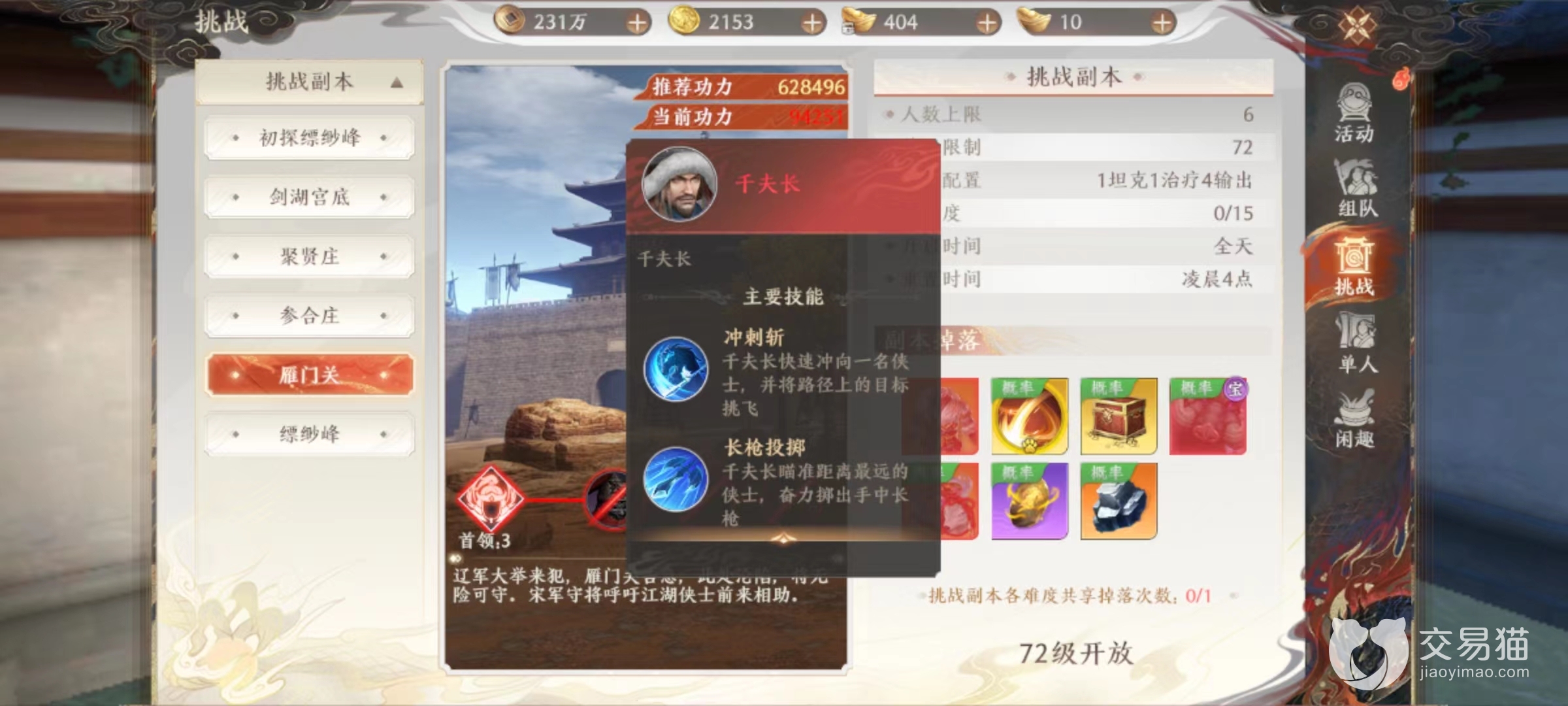 雁门关属于比较高级的副本,需要达到72级之后组成6名玩家才能去挑战。推荐功力要达到60万以上,小编认为最好达到70万再去,这样留有更多余地。整体来说对操作方面要求并不高,但是硬件上一定要到位,不然伤害扛不住,即使走位再精妙也难以通关。