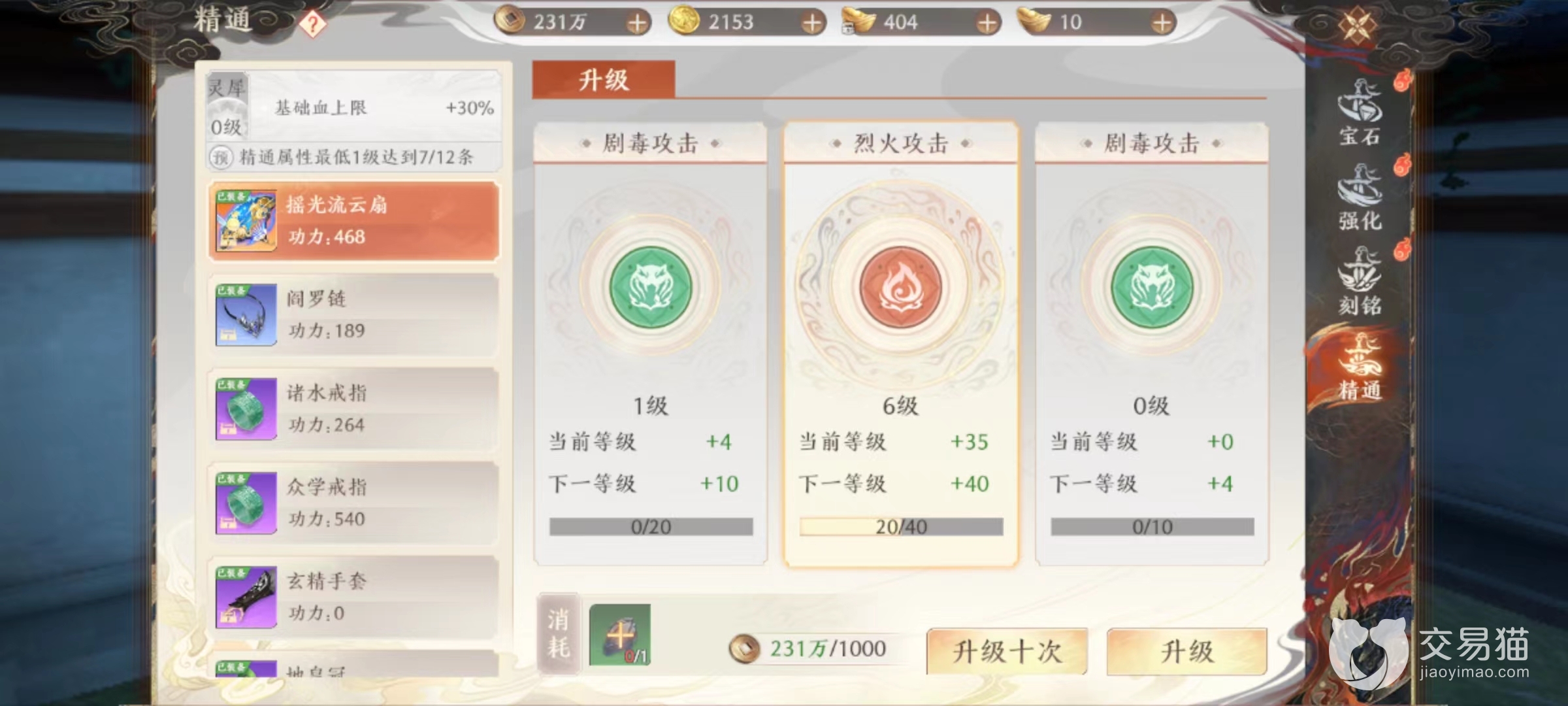 而要想提升这两点,除了装备所附加词条之外,在精通中也有对应属性攻击,需要消耗玄铁或是精金来提升。还有很重要一项就是宝石,也是属性主要来源。每件装备上都可以镶嵌4个普通宝石,中间还有效果独特的雕琢石,用于提升宝石主要效果。但是在属性方面依然是普通宝石为主,这里大家可以重点镶嵌上烈火,也可以镶嵌剧毒。例如武器,项链,戒指和手套等都可以在前面两个孔中优先镶嵌属性宝石,用于提高伤害。