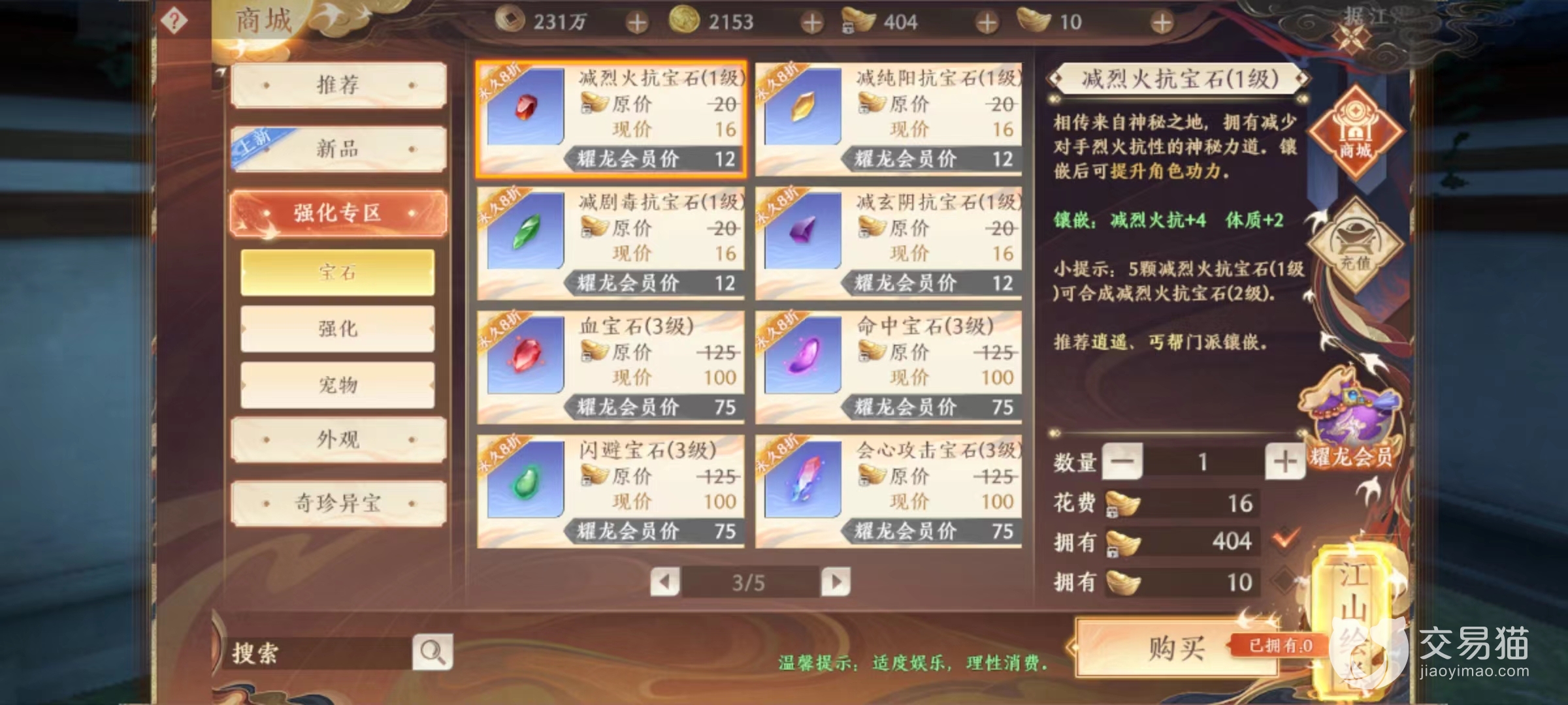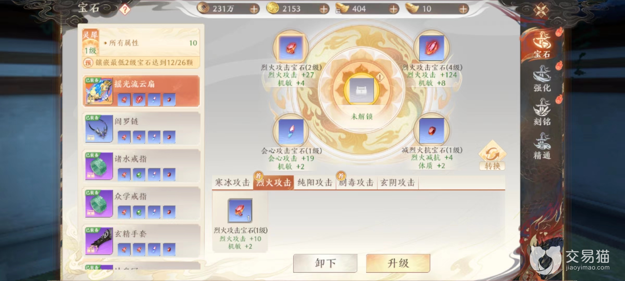除此之外,还有少数镶嵌孔可以向上降低对方对应抗性的宝石,而对逍遥来说,最重要就是降低对方烈火或是剧毒属性抗性。抗性降低后也就意味着主属性伤害更高,这些宝石选择就要根据上面来搭配,如果重点强化是烈火,那么就降低对方烈火抗性,如果是剧毒,就降低剧毒抗性,这样才能将效果完美发挥出来。这些宝石后续还能升级,效果更出色。