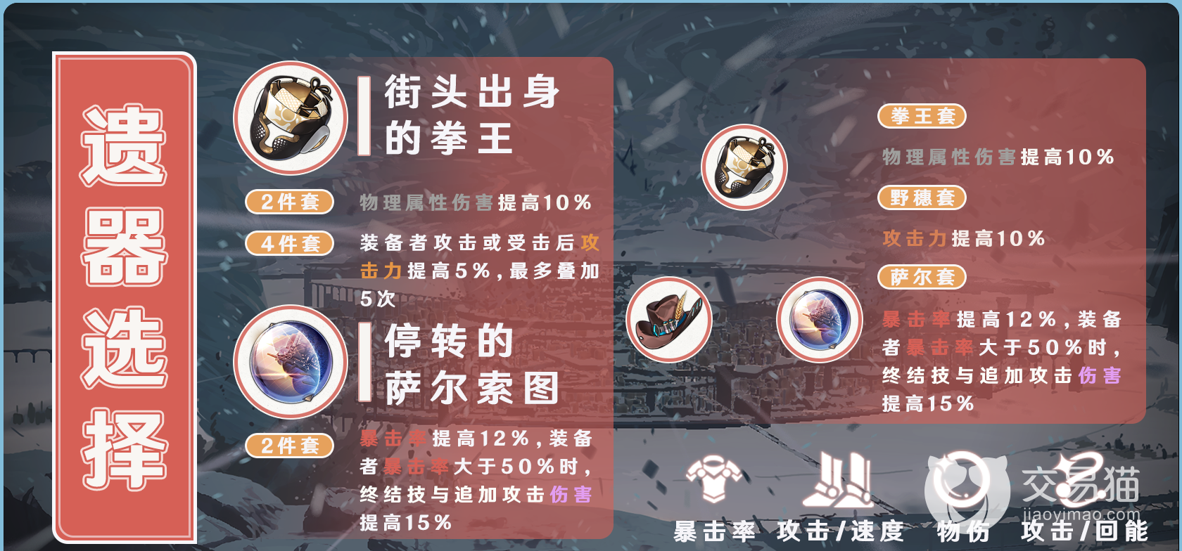 首先我们需要注意的是,克拉的仪器选择可以是街头出身的拳王,拳王套可以给克拉拉增加10%的物理伤害,在四件套成型之后,可以给装备者的攻击或者受击后的攻击力提高5%,最多可以提高五次,这样就可以大幅度提高克拉拉的伤害。