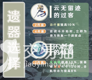 有很多玩家都会将这一个角色作为辅助去玩,辅助主要的作用就是保护队友,避免让队友受到伤害,因此玩家可以选择云无留迹,这一套遗器主要的额外附加效果为治疗提高10%,对于纯辅助来说有着很大的优势。