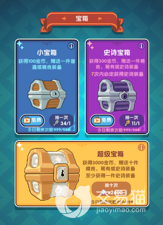 勇者秘境中多种挑战赛和各个道具,包括金币,宝箱,升级劵等,今天小编带大家了解下勇者秘境宝箱有哪些。在游戏中会出现多种级别宝箱。小宝箱,史诗宝箱,超级宝箱。小宝箱可以通过银钥匙开启,当开启后可以随机获得100个金币并赠送一件普通或精良装备。小宝箱只能抽取到普通或精良的装备。获取精良装备的概率是30%,获取普通装备的概率是70%。