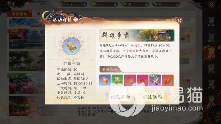 作为大规模团战玩法,群雄争霸呈现激烈帮派厮杀,它不是随时畅玩,而是新服务器开启九天之后,在每个星期的星期三和星期四晚上进行,只有不到两个小时。