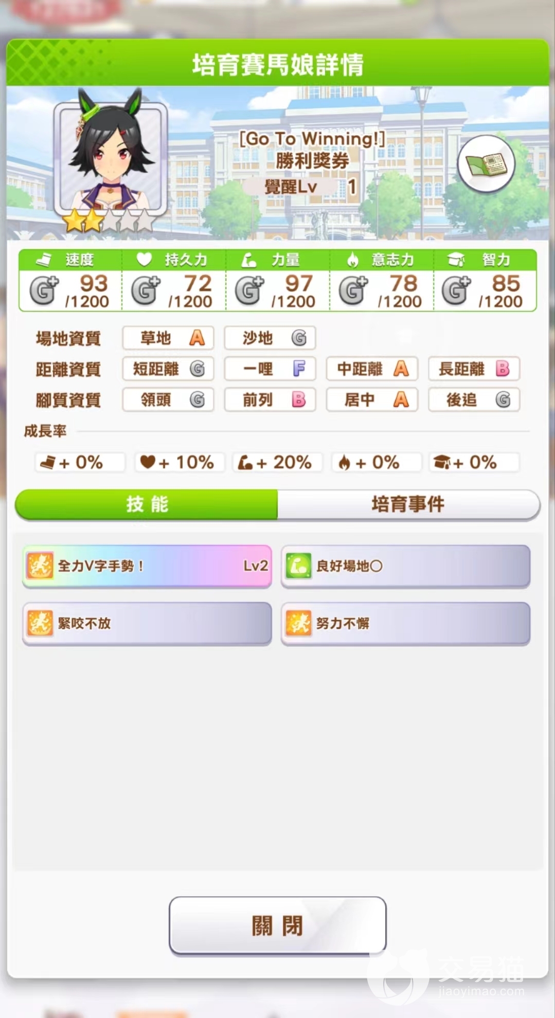 胜利奖券整个的培育目标竞赛中有,G1赛菊花赏和有马纪念这两个长距离比赛,但是胜利奖券长距离资质只有B。如果直接这样去跑的话也不是不能赢,最好是继承1个1星长距离红因子,把长距离资质提到A。所以,要注意在这两场比赛前练够持久力,经典级10月前半前要耐力达到400,资深级12月前半前要耐力达到500~600,就不太会因为持久力不足输掉比赛。如果还有学回复持久力的技能的话会更稳。