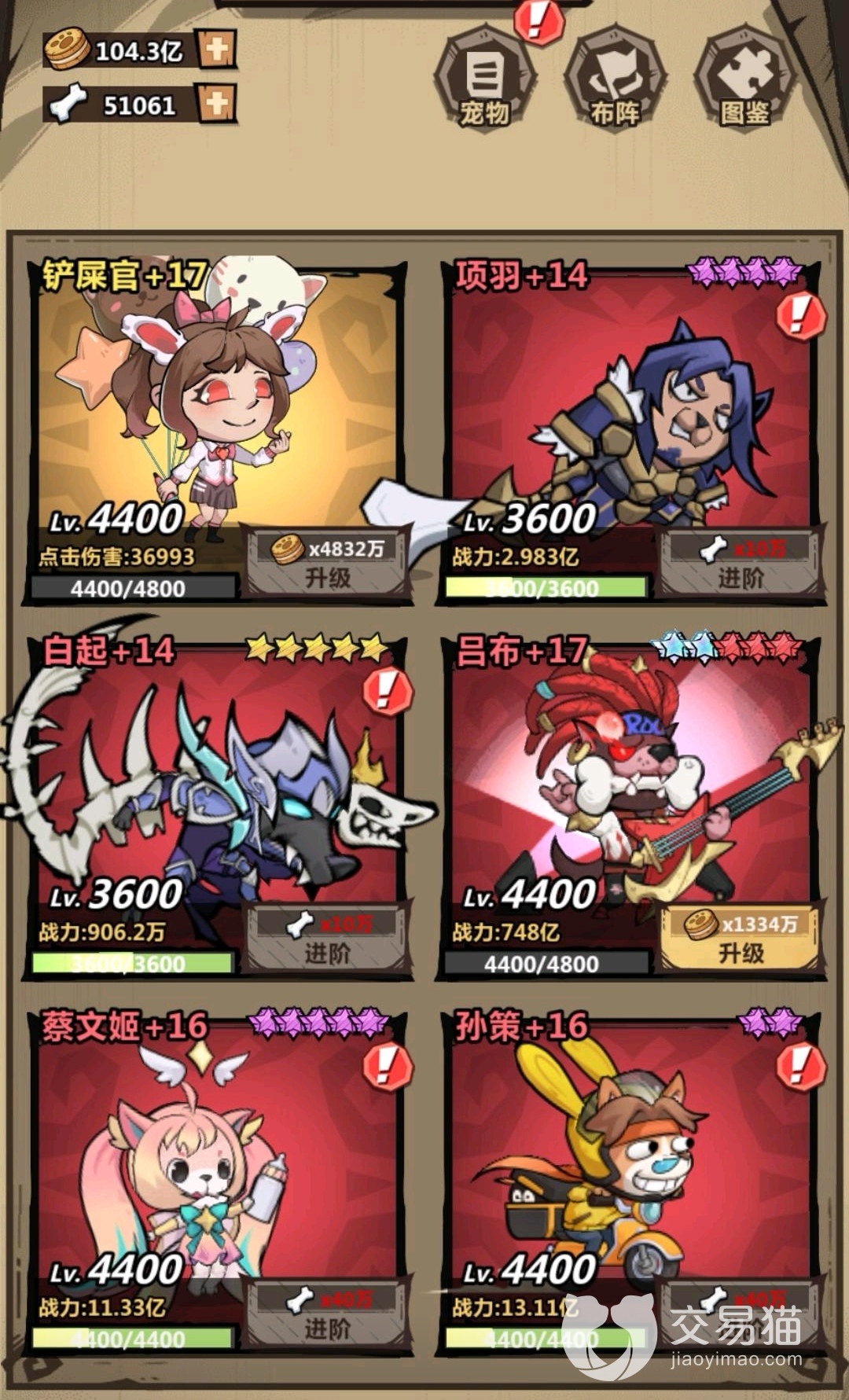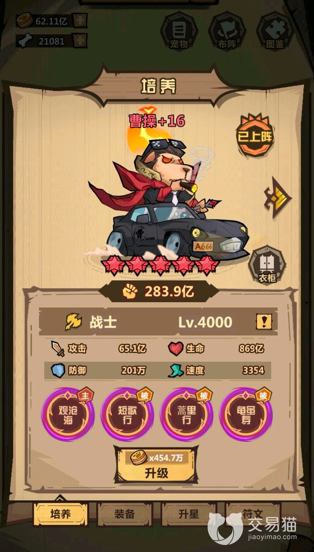 荆轲就是刺客定位的狗将,比较强力的爆发和超快的速度,让它有机会闪避敌人的攻击,还能对敌方进行一波偷袭式的输出攻击,关羽则是位强悍的肉盾,坦度极高,很抗揍,玩家培养它的主要方式就是给它升级,越高越好,升到700级后,关羽是有极强的爆发力的,速度也会得到一个质的飞跃,这在战斗里就会变得特别有优势。