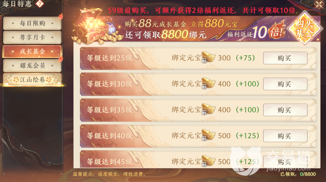 成长基金:适合缺元宝的长期玩家选择,购买之后可立刻获得880元宝,并且之后随着主角的等级提升还可以逐渐领取额外的元宝,共计会赠予你多达8800元宝,这些元宝你可以前往商城购买各种道具和资源,同时缺宠物的话还可以考虑积攒一下来直接入手一个神兽。