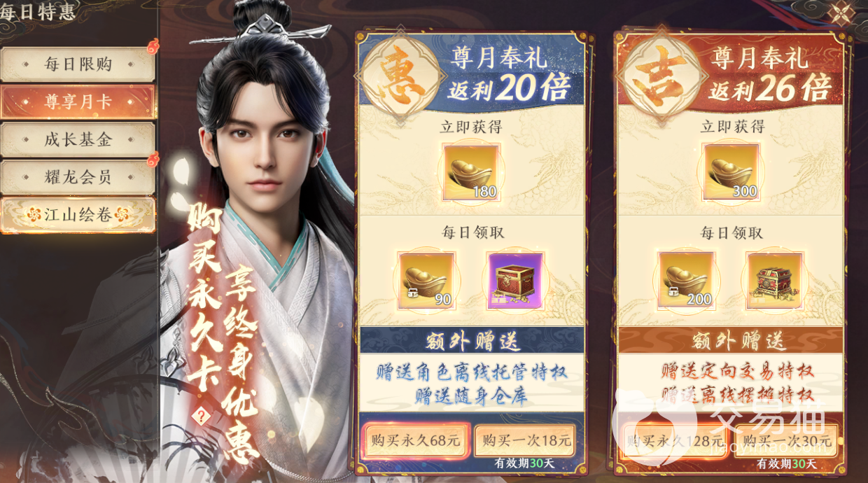 尊享月卡:多达二十余倍的返利,并且额外赠送托管,交易,摆摊和随身仓库多项特权,建议直接买两个永久,这样每天还能获得大量元宝。