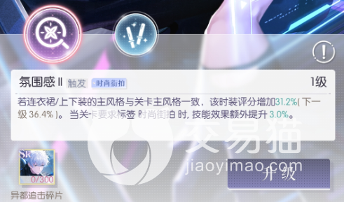 小众衣品这个技能的主要作用就是在减少未上身时装评分的情况下,大幅增加当前搭配时装的评分。它总共有三个级别,一级能增加的幅度最低,只有14%;而三级能增加的幅度最高,可以以达到21%。也就是说这个技能发挥的效果,与其等级是呈正相关的。