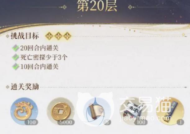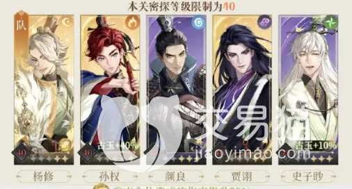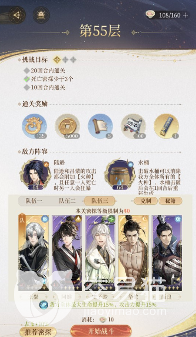 玩家们还需要注意的是一天只有10次探索次数哦,目前每一关都会把等級圧到40级。地宫的难点在于达成三星,三星的条件在每一层会显示。比如这一关的条件是不能用带阴属性的角色,那么我们就不能选择用贾谢了。有的关卡甚至要求不能用带风属性的角色,这个时候我们的男妈妈,也就是狮子猫,就不能安排上场啦。