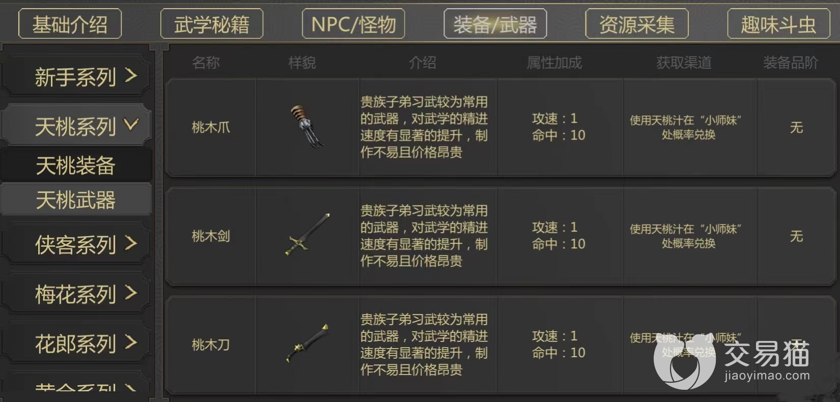 当玩家达到了进阶阶段的话,那选择可就多了,因为到了这个时候,玩家的武器也会进阶,可以说在输出能力以及整体实力上也提高了一个层次,去挑战一些比较高级的怪物,是完全没有问题的,而这些等级高的怪物就有非常大的几率会掉落武器了,作为过渡期的新手玩家来说,可以先从中去收集天桃武器,这个其实还是比较好收集的,只需要玩家利用桃汁,然后去兑换就行了。