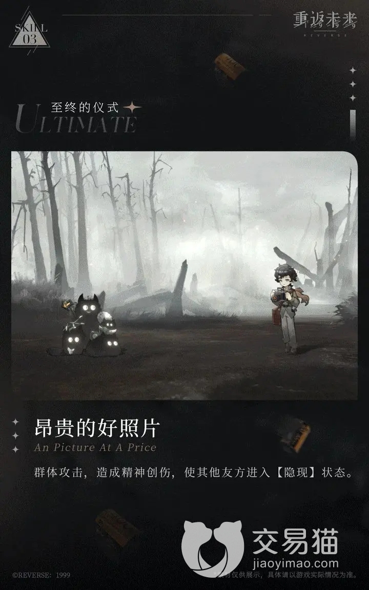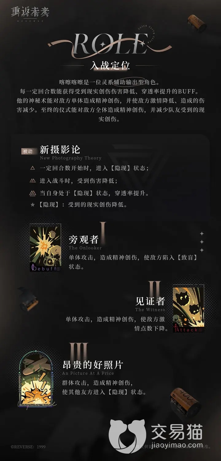 人物背景介绍:重返未来1999喀嚓喀嚓,在他活着的时候,喀嚓喀嚓就是一位业绩平平的战地记者,它的拍摄作品从来没有被大家所认可,当然这也和他本人的迟钝有关系,因此很多精彩的现场画面总是习惯和喀嚓喀嚓擦肩而过。终于,在他迎来了机会,又是一场战乱过去,各地遍布硝烟,喀嚓喀嚓穿梭于被破坏的坦克、断指残垣和大海之间数日,终于发现了比较好的素材——正在投弹的轰炸机。此时喀嚓喀嚓拿起了照相机对准轰炸机,拍下了它最棒的一张照片,此时炸弹恰好迎面而来......