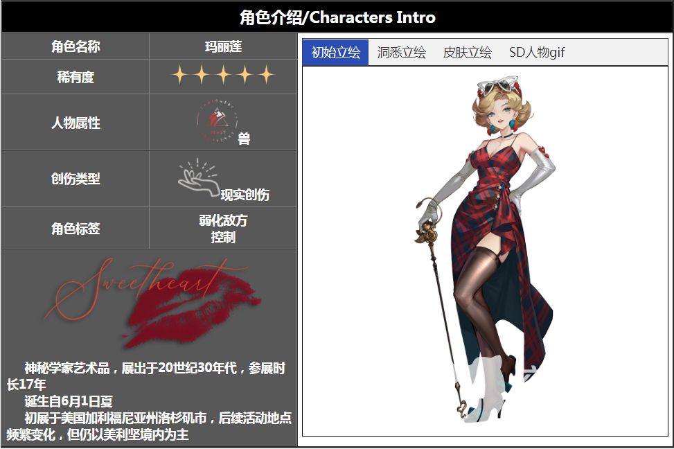 玛丽莲:拥有着妖娆身段的坏女人,也因此获得了很多小伙伴的垂青,她有着精致的脸蛋,身着红黑格子相间的衣服让身材显露无疑,干练的棕色短发,宝石一样的蓝色眼睛,这个角色的刻画可谓是特别的亮眼。她在游戏里的作用也是非常的大,它可以减弱敌人的输出并且持续的控制敌人,作为神秘家的她能持续给敌人造成负面效果,是玩家必须要收集的卡牌之一。