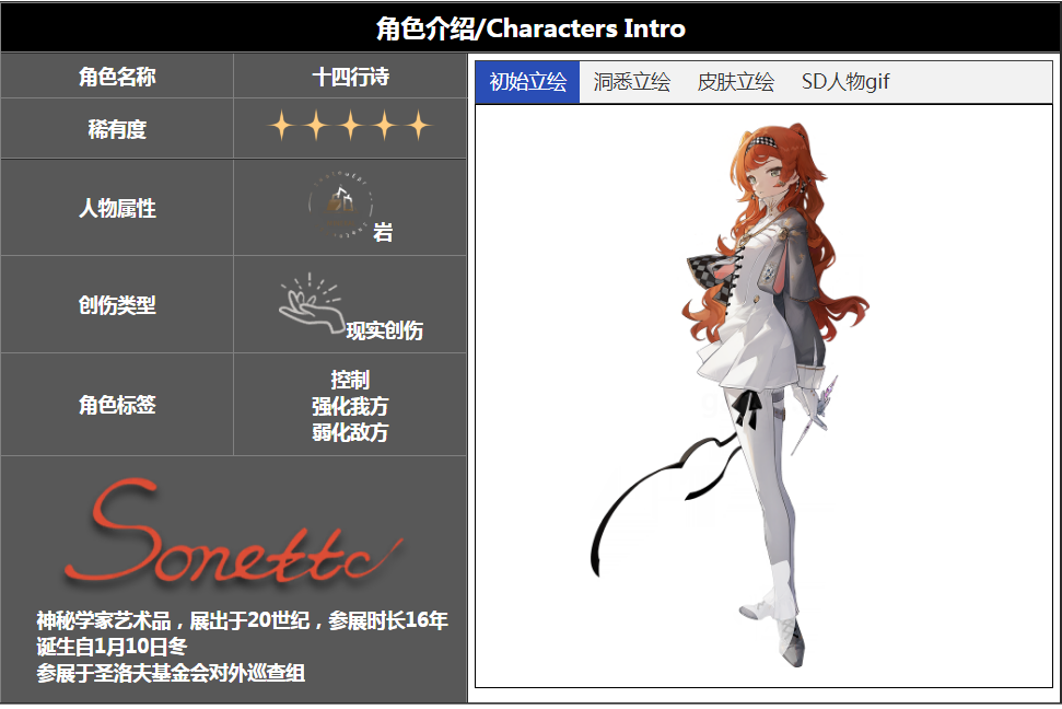 十四行诗:一个没落家族的坏女人,身披一头火红色卷发,她最喜欢穿着一身洁白的名贵礼服出现在各个显眼的地方,给人一种极其高贵的感觉。实际上她的身份是神秘学家,她原本的家族曾经辉煌一时,但因为世界颠倒,时间无序等一些事情,家族终究没落,但是十四行诗从来没有放弃过要复兴家族的愿望,这也是她下定决心要振奋下去的理由。