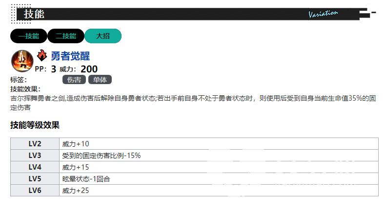 吉尔的大招勇者觉醒,当吉尔释放完二技能进入勇者状态之后,大招技能威力值200;如果出手前自身的状态不在勇者形态的话,使用该技能会受到当前生命值35%的固定伤害。所以吉尔的二技能而大招配合使用的话会打出更高的伤害,后续技能提升之后,威力值还会增加50点,可谓是非常厉害了!